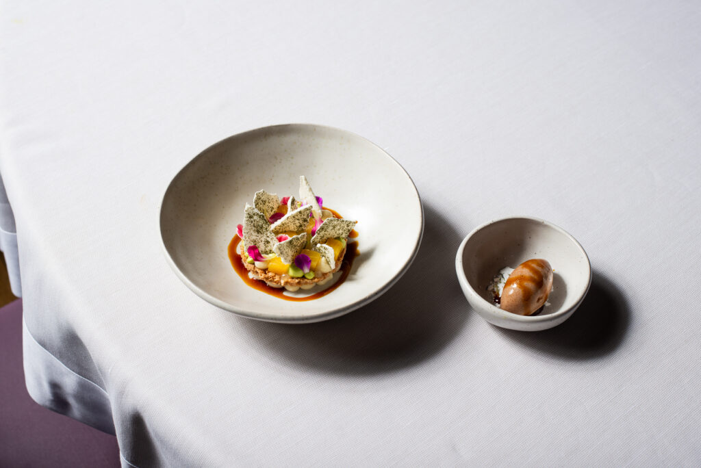 A chiudere il menu, il dessert vegano Carruba, ananas e menta, composto da un sorbetto di carruba a base acqua, una namelaka al cioccolato bianco Amatika Blanche (dalla dolcezza della mandorla e dalle note di frutta secca), menta in polvere e in foglie cristallizzate, ananas e foglie di menta e un cocktail a base di Botran Ron de Guatemala, sciroppo di carruba e menta.