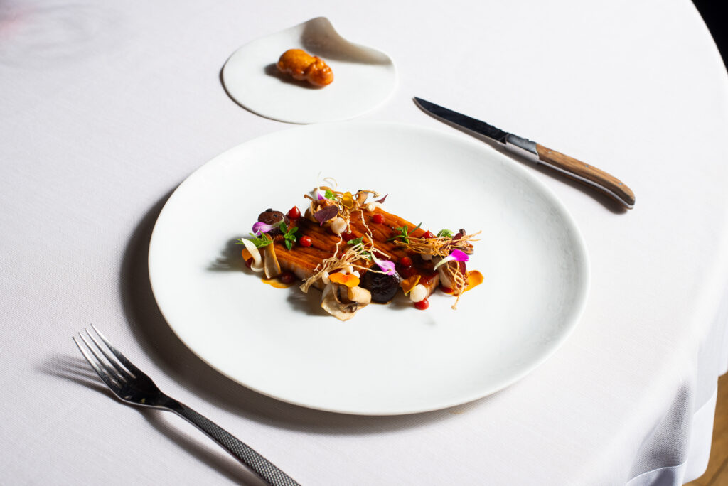 Per il secondo invece, un drink realizzato con Prime Uve Nere (speziato, con note di vaniglia e frutti di bosco, al palato pieno, morbido e intenso) e kombucha di funghi ha accompagnato la Pancia di maialino, funghi e ‘nduja, una carne cotta sottovuoto per 12 ore e servita con una glassa a base di tamarindo, quattro tipologie di funghi (cardoncello planciato, pioppino conservato in aceto, enoky essiccato, shiitake conservato in kombucha) e n’duja.