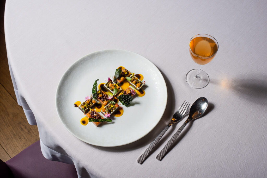 Il percorso pensato dallo chef Stefano Sforza è iniziato con due antipasti. Terrina di fagioli, melone, salvia, miso valorizza quattro varietà di fagioli (azuki verdi e rossi, neri sudamericani e borlotti) all’interno di una terrina. A completamento, una crema a base dell’acqua di cottura dei legumi, miso di fagioli borlotti, fagioli bolliti, una salsa di melone Cantalupo, melone a tocchetti e salvia, in olio e in foglie. Per enfatizzare il sapore umami della ricetta, è stato pensato un drink realizzato con l’Amaro Pratum Biologico shakerato con foglie di salvia e completato con qualche goccia di soda. Le caratteristiche del distillato utilizzato, dal basso contenuto di zucchero e un sapore intenso, risultato dell’infusione di un’attenta selezione di botaniche certificate biologiche, tra cui camomilla, menta, timo, salvia, tarassaco, piantaggine, genziana e cardo mariano, ben si sono equilibrate al piatto.