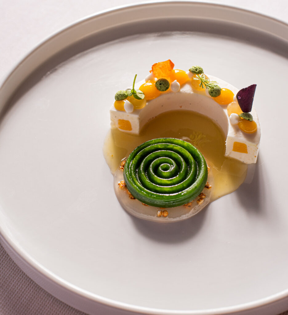 Il dolce proposto è Broccolo, arancia, miele. Qui lo chef ha trattato l’ortaggio alla pari di un frutto, trasformandolo in sorbetto e utilizzando come dolcificante diverse tipologie di miele, tra cui il profumato ai fiori d’arancio.