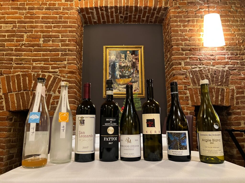 In particolare, la proposta di abbinamenti al menù Brassicaceae segue un percorso, che parte in una fase iniziale, con un vino leggero, sapido, molto magro che lascia molto delineato quello che si sta mangiando, per poi continuare sui primi, con una bottiglia aromatica per calmierare le spinte amaricanti e acetiche, per proseguire con uno Chardonnay da zone più vocate al mondo. Infine il dolce viene accompagnato da un sakè Junmai Ginjo: scelta anch’essa non convenzionale che si equilibra perfettamente alla portata.