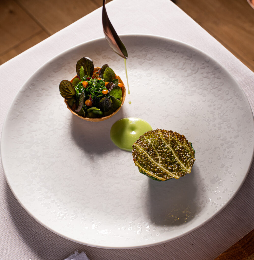 L’abbinamento viene proposto con verza & pak-choi – altre 2 genetiche della famiglia Brassicaceae: un piatto composto da un semisfera formata alternando foglie di verza lessa e besciamella vegana chiusa in superficie da una foglia di verza croccante accompagnata dal suo contorno: una tarte farcita con una royale di pak-choi (tipologia di cavolo conosciuta per le sue acidità naturali). A completare una emulsione di centrifugato sempre di pak-choi.