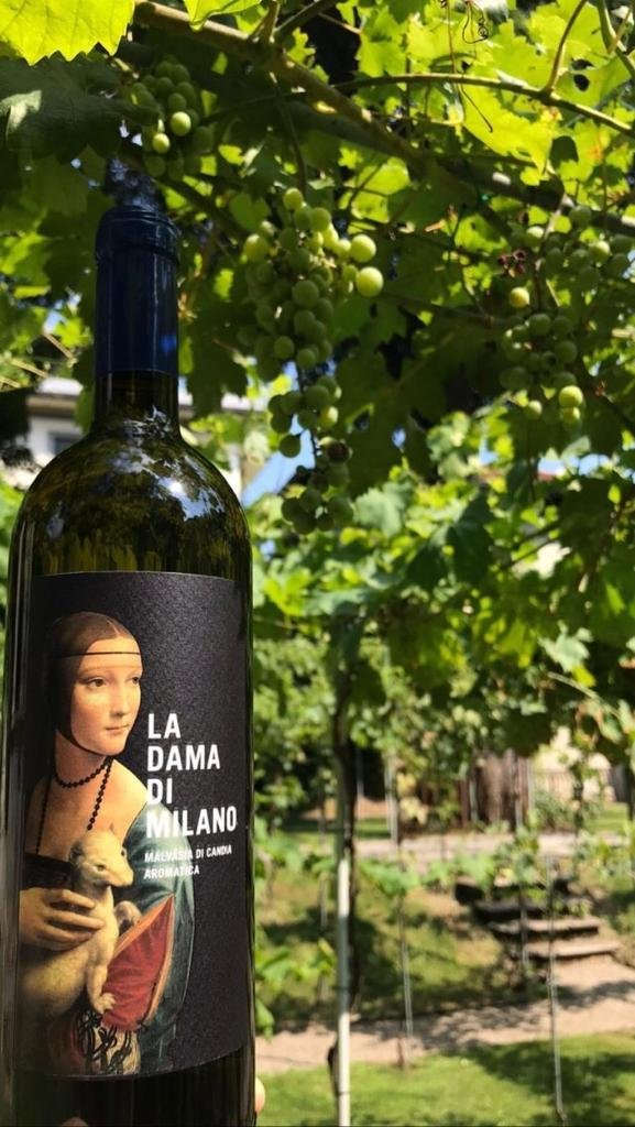 La Dama di Milano è invece il vino che nasce dalla stessa e preziosa uva, Malvasia di Candia aromatica – vitigno di Leonardo, e ancora oggi coltivata dal Castello di Luzzano, tra Pavia e Piacenza. Le sue caratteristiche sono: colore giallo paglierino brillante; profumo intenso, con note floreali di acacia, cipresso e menta; sapore tipicamente aromatico, equilibrato e morbido. La bottiglia è realizzata in tiratura limitata ed è dedicata a La Dama con l’Ermellino, il dipinto di Leonardo da Vinci che ritrae Cecilia Gallerani, poetessa e amante di Ludovico il Moro. Si può trovare anch’essa presso lo spazio espositivo del museo.
