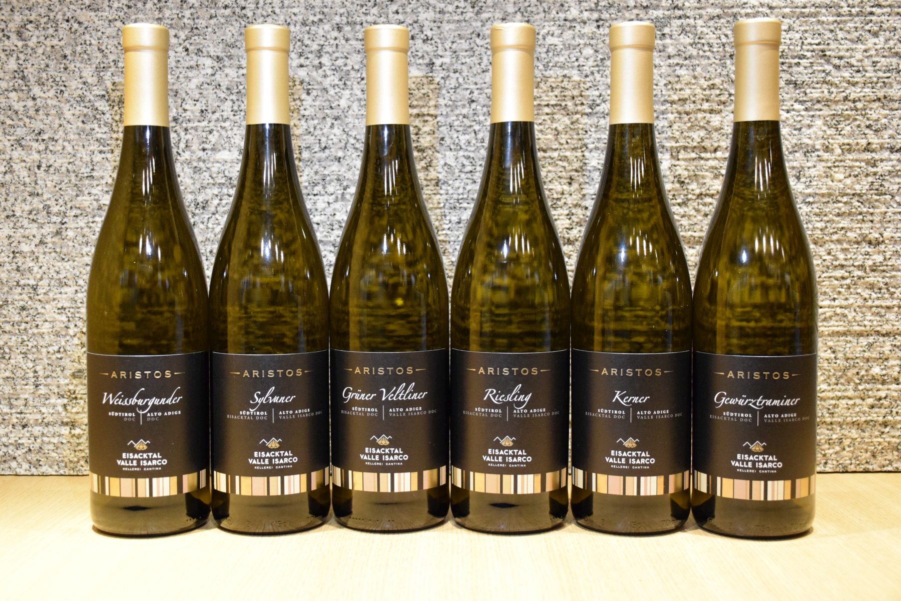 Il Muller Thurgau Aristos, invece è coltivato in altitudine e, grazie al clima fresco e agli sbalzi di temperatura a cui è sottoposto, si rivela fresco ed estremamente aromatico, nonché equilibrato e sapido al punto giusto.